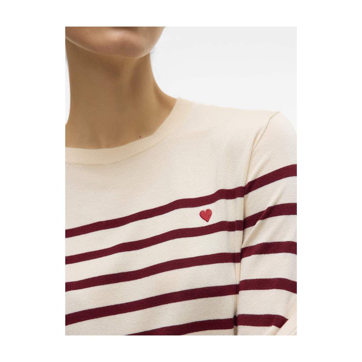 Ce pull marinière revisité combine confort et élégance avec sa base beige lumineuse ornée de rayures bordeaux. Conçu dans une maille douce et légère, il offre un confort optimal tout en apportant une allure moderne et intemporelle.