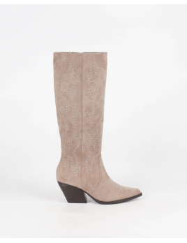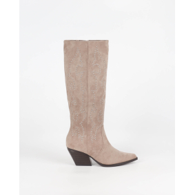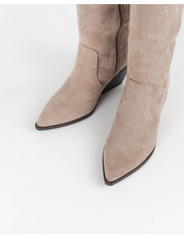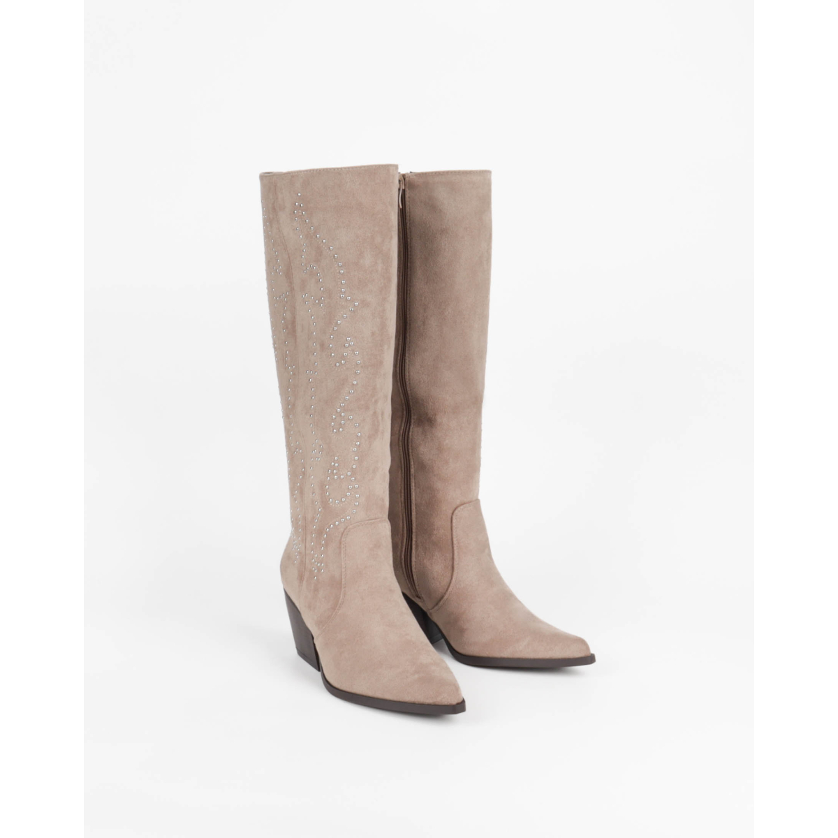 Apportez une touche de style western chic à vos tenues avec ces bottes hautes en suédine taupe. Leur design élancé et leur bout pointu allongent la silhouette, tandis que les clous argentés délicatement disposés sur la tige dessinent un motif élégant et lumineux. Le talon biseauté offre une allure affirmée tout en restant confortable au quotidien.